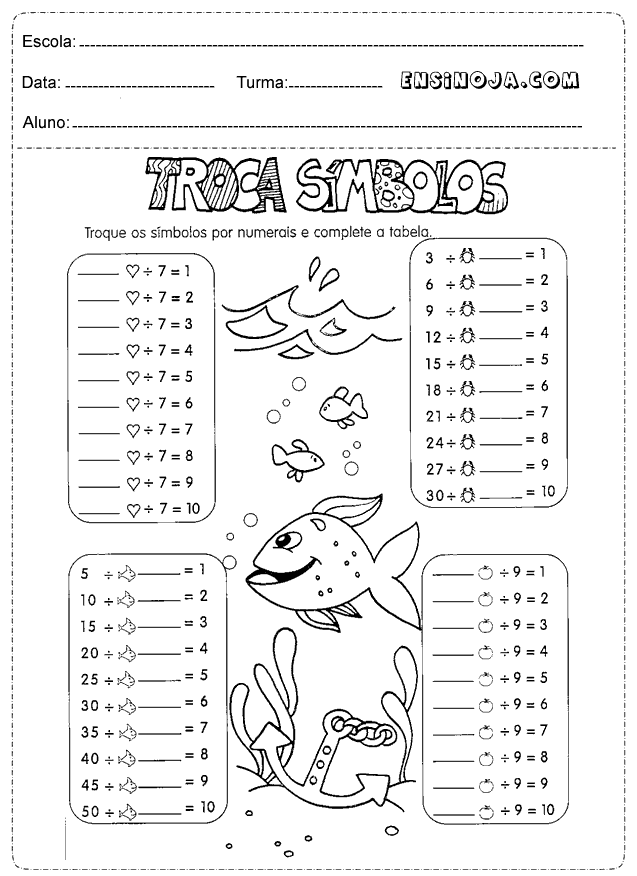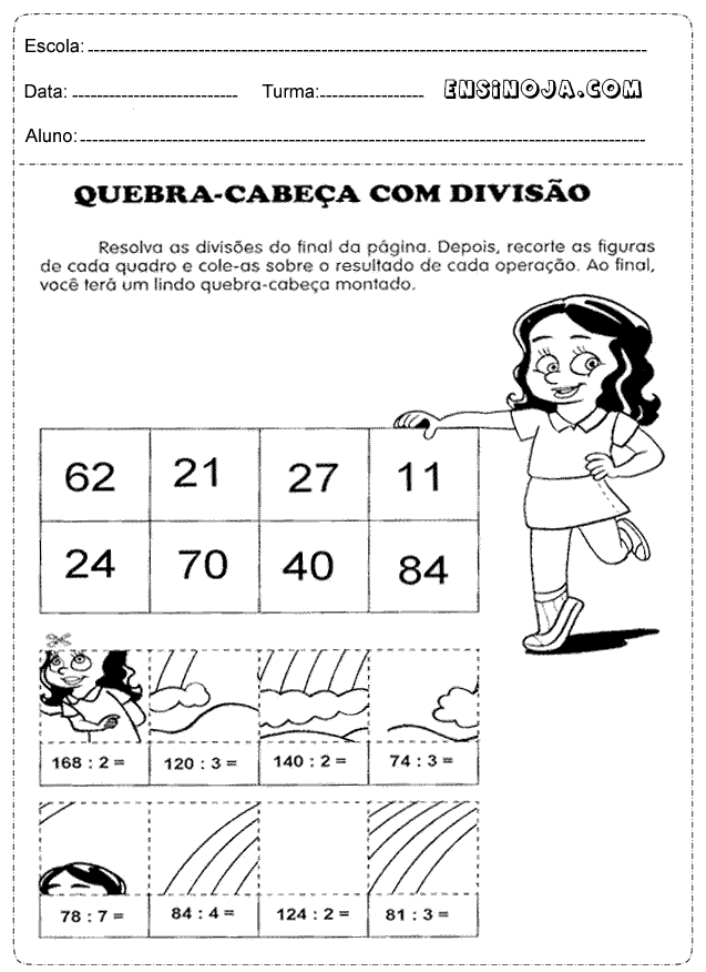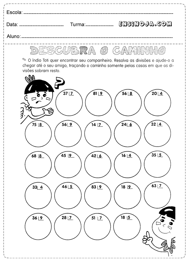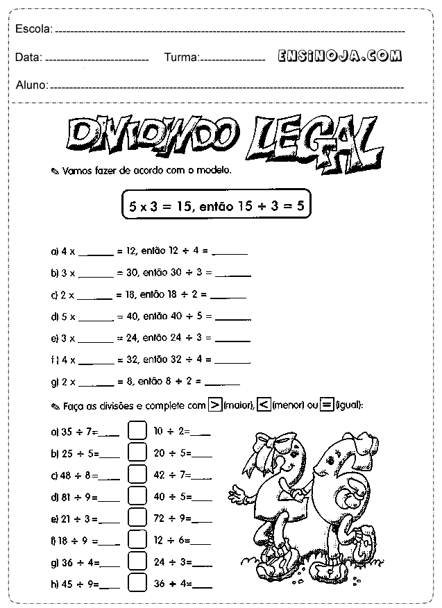 Atividades de matemática sobre divisão para os alunos do 3° ano do ensino fundamental. As atividades acompanham o conteúdo escolar, reforçando o que o aluno está aprendendo em sala de aula. As atividades possibilitam uma formação matemática adequada ao aluno, pois os conteúdos são apresentados em linguagem clara e acessível à série a que se destina, de maneira sistematizada.